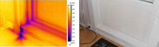 Termogram og foto viser dørterskel med trekk. Mørke farger viser kald flate, Her skyldes kalde feltet trekk fra foring i dør og terskel. Normalt begrenses kravene til termisk komfort til en oppholdssone f. eks en kontorplass eller ved sittegruppe på stua. Oppholdssonen begrenses horisontalt av gulvet og et plan 1,8 m. over gulvet. Vertikalt begrenses sonen av loddrette plan parallelle med rommets vegger, i en avstand av 0,6 meter fra disse. Det kan være utfordrende å måle trekk ved disse avstander i selve oppholdsonen. Det er derfor vanlig å måle ved selve lekkasjepunktet, ofte ca. 20 – 30 m.m. avstand. Luftlekkasjer kan skyldes flere forhold. Luftlekkasjer gjennom yttervegg skyldes vanligvis at vindtetting ikke er tilfredstillende montert eller er defekt. Utelufta vil dermed kunne infiltrere veggkonstruksjonen og finne veg inn til oppholdsrom. Drivkreftene kan forårsakes av vindtrykk eller undertrykk i bygget. Luft har en tendens til å finne de minste lekkasjepunkter. Gjennomblåsning kan skje ved utettheter i vindtettingssjikt eller i skjøter og sammenføyninger rundt vinduer eller tekniske gjennomføringer. Kald luft kan også trekkes ned fra kalde loft og sjaktforbindelser. Luftlekkasjer i bygningskonstruksjonen er med på å redusere veggens isolerende egenskaper.